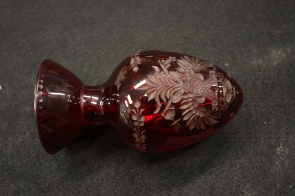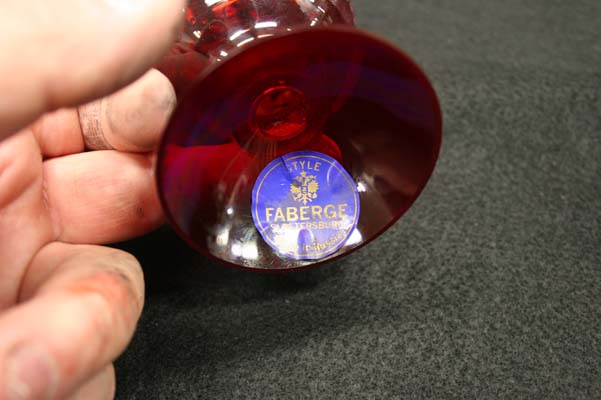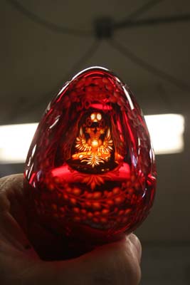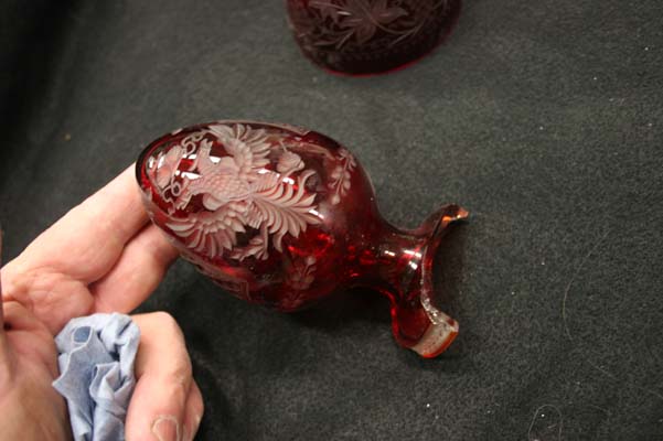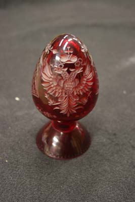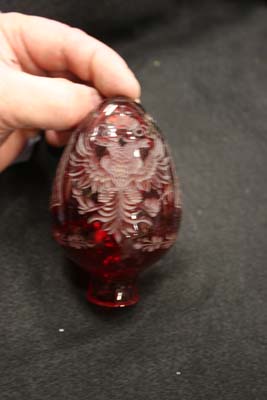 Sunday, May 2nd, 2010 Posted in All Repair Projects, Antique Glass Repair, Broken glassware, Etched Glass, Glass Sculpture Repair, Glueings | Comments Off on Glass repair Faberge Egg broken glass baseA beautiful red glass ” FABERGE EGG” with a broken base was sent to me for repair. This piece was made in Russia St. Petersburg as stated on the label. The copper wheel engraving of the double eagle is the main design with a very delicate boarder on the base .