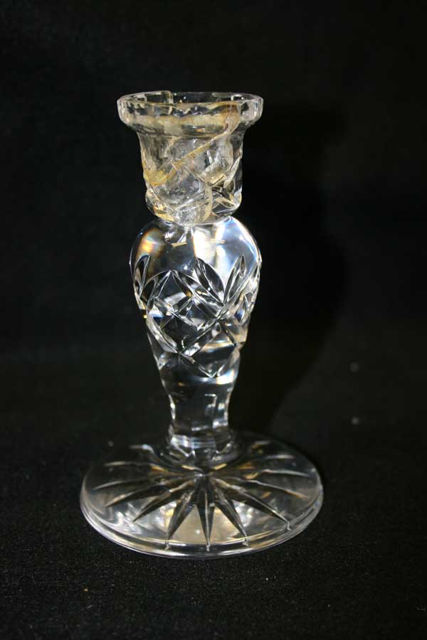 The age old question of whether hiring a professional to make a repair or attempting to do it yourself is timeless. In this case, I was able to repair the original damage, and fix the damage from the attempted repair, as well. The old glue had yellowed, and the super glue finger prints needed to be removed. This kind of glue may be able to stick a man to a steel beam, but it won’t repair a delicate glass candlestick. Super glue is the wrong adheasive for glass. By letting the candle burn too low the candle cup was cracked. This is a common repair, and easy for me to do- send it to a professional.