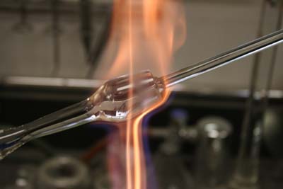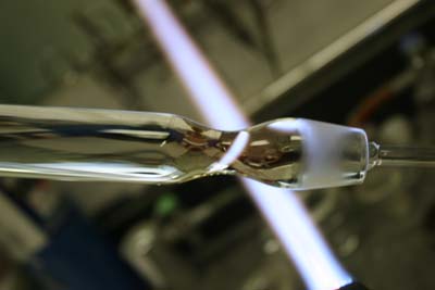 Tuesday, May 5th, 2009 Posted in All Repair Projects, Antique Glass Repair, Blowen Glass Replacements, Broken glassware, Chandelier Repair, Chipped Glass Repair, Stopper Repair | Comments Off on Antique Glass Repair- broken stopperAn antique glass decanter with a broken stopper was brought in for repair. The stopper broke off many years ago and was lost. The owners still had the silver top to the stopper, but a new glass bottom had to be made. I started with a glass rod a little larger than the neck of the decanter. I ground the end of the glass rod to fit the neck of the decanter. I made a stem on top of the stopper through heat and manipulation. This was fitted in to the silver top. The other chips on the bottle were left alone because they all had a story to go with them.