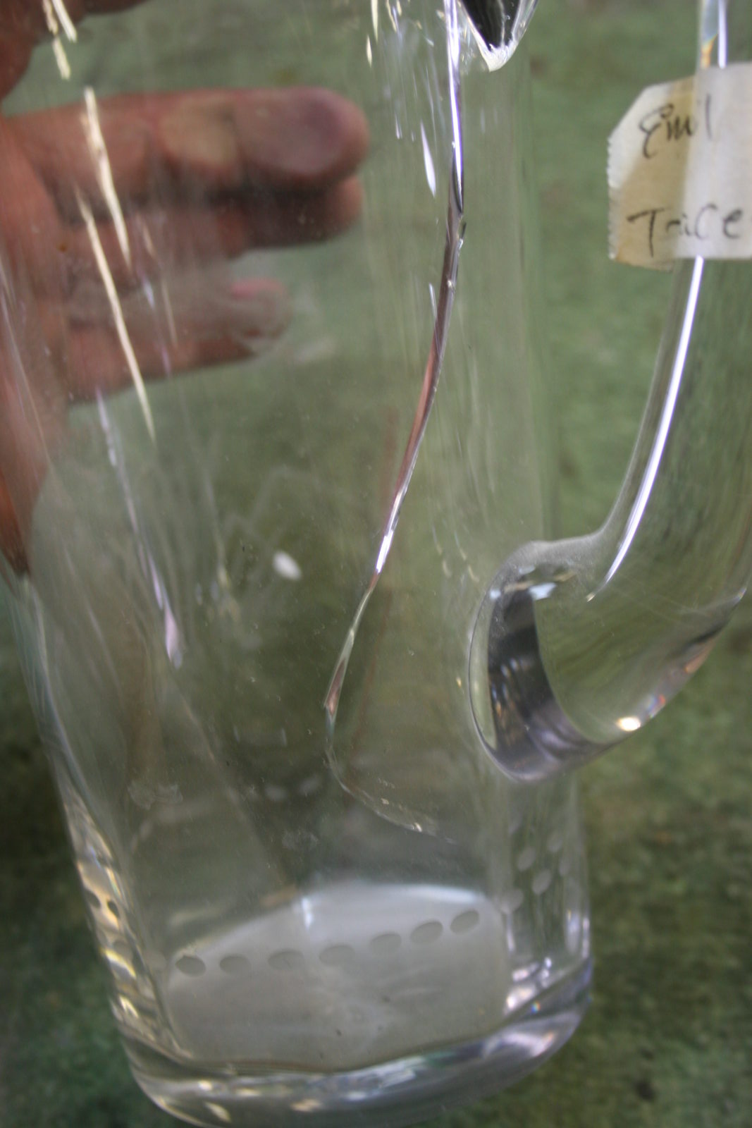 Thursday, April 11th, 2013 Posted in All Repair Projects, Broken glassware, Glueings | Comments Off on crystal repair chipped crystal pitcher with a crackThe old crystal pitcher has been in the family for many years. It has served many cold drinks at grandmas house. The sentimental value is the motivation for the repair. A crack has run from the top down the left side of the handle almost to the bottom. The plan is to run the crack around the bottom of the handle and up the right side of the handle to the top. Controlling the path the crack takes is critical. I have spend years refining this skill.
