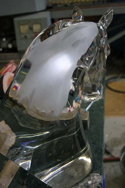 Tuesday, April 14th, 2009 Posted in All Repair Projects, Glass Sculpture Repair, LaLique Crystal Repair | 1 Comment »This large glass sculpture was damaged when an earth quake knocked prisms off of a chandelier onto the sculpture below. This very large, very expensive, LaLique Crystal Horse Head sustained many small chips from each of the falling prisms. Crystal repair on such a heavy piece of glass over such a large area can be tricky, but the sculpture’s appearance, and it’s value were completely restored.
