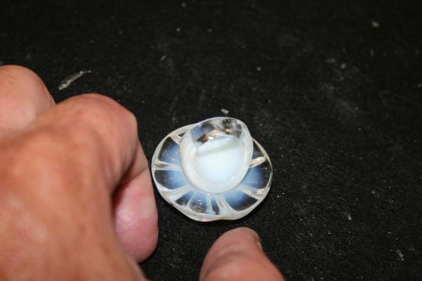 Wednesday, January 6th, 2010 Posted in All Repair Projects, Antique Glass Repair, Broken Decanter Repair, Chipped Glassware, Stopper Repair | Comments Off on crystal repair steuben bottle stopperIts a small little chip on the bottom of the stopper. Steuben makes the finest crystal in the world but they made colored glass many years ago. This is one of the old ” colored glass” Steuben pieces. They are very valuable so a small chip is well worth repairing. The repair is simple just grind the stopper down . The important part is to match the same grit size so the frosting on the glass is the right . I have been a crystal repair man for thirty years and I love glass. I get crystal sent to me from around the world and I very lucky to be able to repair so many nice pieces of glass.