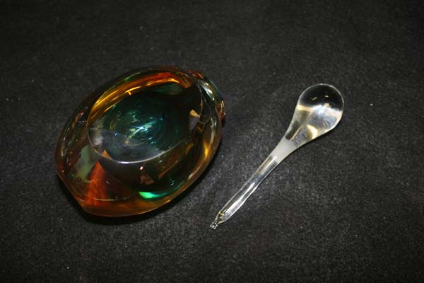 Wednesday, January 6th, 2010 Posted in All Repair Projects, Antique Glass Repair, Broken Decanter Repair, Chipped Glassware, Stopper Repair | Comments Off on crystal repair steuben bottle stopperIts a small little chip on the bottom of the stopper. Steuben makes the finest crystal in the world but they made colored glass many years ago. This is one of the old ” colored glass” Steuben pieces. They are very valuable so a small chip is well worth repairing. The repair is simple just grind the stopper down . The important part is to match the same grit size so the frosting on the glass is the right . I have been a crystal repair man for thirty years and I love glass. I get crystal sent to me from around the world and I very lucky to be able to repair so many nice pieces of glass.