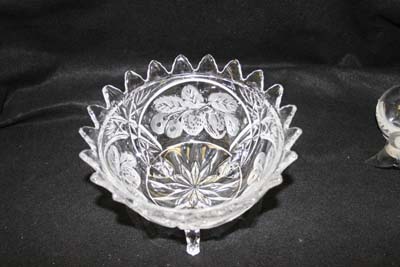 Cut glass bowl with a missing foot. The leg broke off and was missed placed over forty years ago .